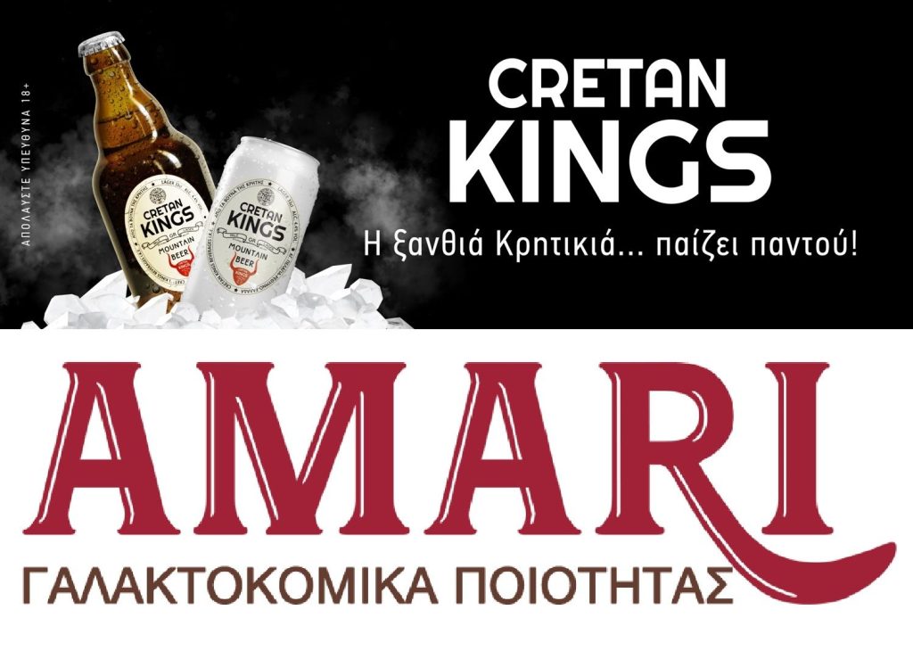 Η μπύρα Cretan Κings είναι μία ξεχωριστή ξανθιά Lager, απαλή και κρυστάλλινη από επιλεγμένες εξαιρετικής ποιότητας πρώτες ύλες. Τα Kρητικά τυριά Amari παράγονται με σεβασμό στην παράδοση, με γνώση της τέχνης της τυροκομίας, με εμμονή στην άριστη ποιότητα του τελικού προϊόντος, με επιμονή στην τήρηση της ορθής επεξεργασίας, με υπομονή στους χρόνους ωρίμανσης, με διάθεση για συνεχή βελτίωση και εξέλιξη, μα πάνω απ’ όλα με αγάπη για τον άνθρωπο και ενδιαφέρον για την διατροφή του.