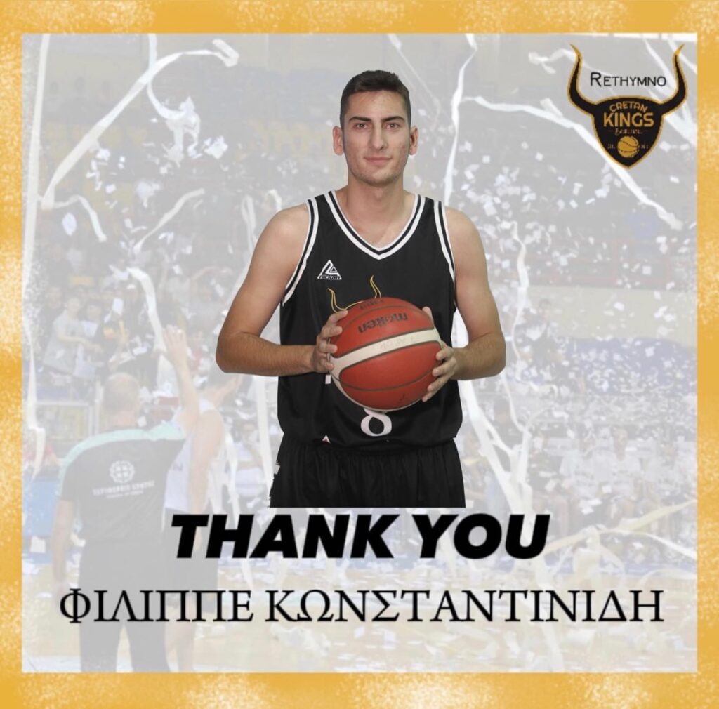 Το Ρέθυμνο Cretan Kings ευχαριστεί τον Φίλιππο Κωνσταντινίδη, για την συνολική προσφορά του στην ομάδα όλα αυτά τα χρόνια, από τα τμήματα υποδομής, όπου ξεκίνησε τα πρώτα του μπασκετικά βήματα μέχρι και την συμμετοχή του στο αντρικό τμήμα.