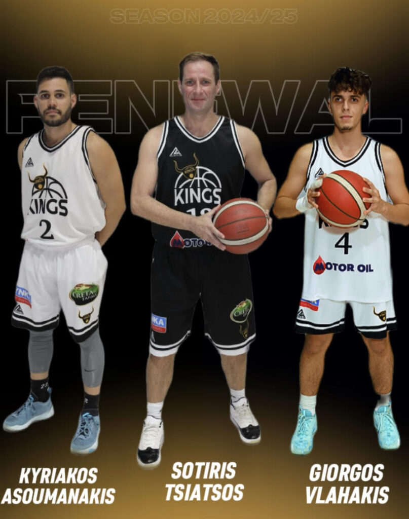 Στην ομάδα του Ρέθυμνο Cretan Kings θα συνεχίσουν να αγωνίζονται ο Σωτήρης Τσιάτσος , Γιώργος Βλαχάκης και Κυριάκος Ασουμανάκης , με τους οποίους ανανεώθηκε η συνεργασία και για τη νέα σεζόν. Ακόμα τρεις αθλητές με εμπειρία, θα συνεχίσουν να φοράνε την φανέλα των “Βασιλιάδων”.