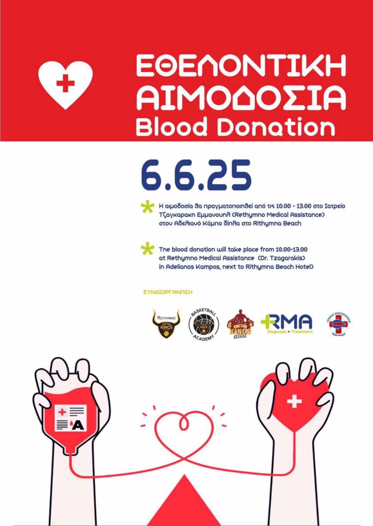 «Το Ρέθυμνο Cretan Kings, ενημερώνει τους φίλους του, ότι την Παρασκευή 6 Ιουνίου, στο πλαίσιο του Κοινωνικού προγράμματος, Cretan Kings Assist διοργανώνει Εθελοντική Αιμοδοσία, σε συνεργασία με τα ιατρεία Rethymno Medical Assistance και το Γενικό Νοσοκομείο Ρέθυμνου.